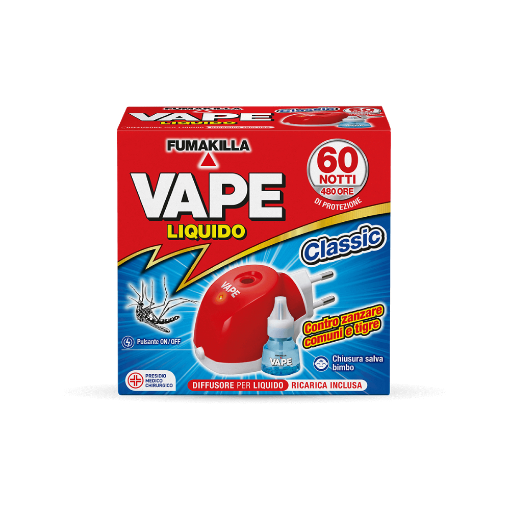 VAPE LIQUIDO Classic è un insetticida liquido per elettroemanatore efficace contro le zanzare degli ambienti domestici, comprese le zanzare delle specie Culex pipiens e Aedes albopictus, in grado di trasmettere pericolose malattie quali Chikungunya e Zika. Grazie alla presenza nella formula di estratti aromatici, diffonde nei locali una gradevole profumazione con note fiorite.